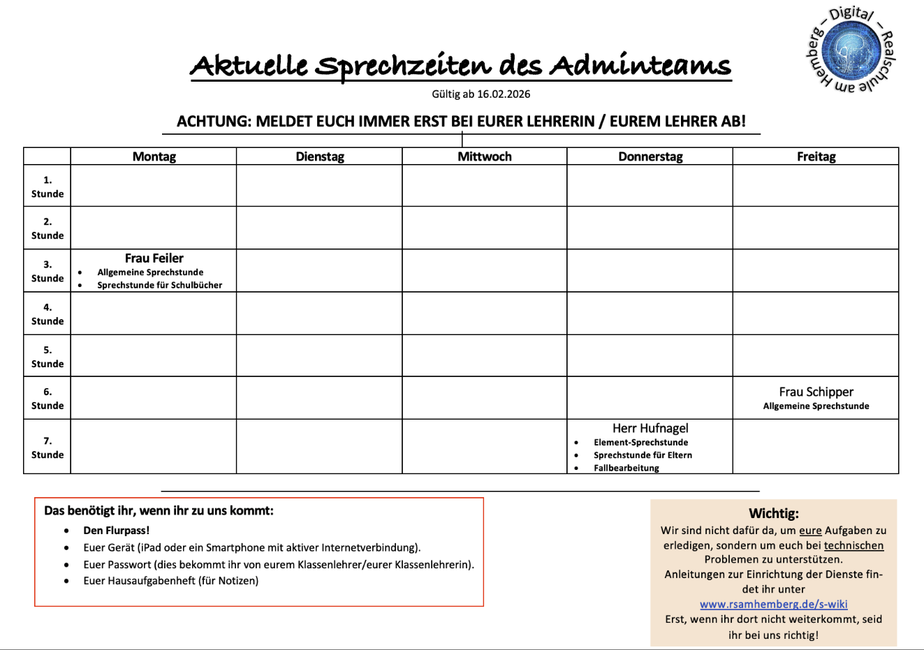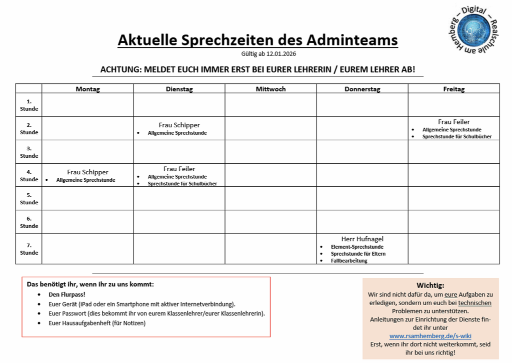Das Admin-Team bietet separate Sprechstunden für Eltern an, um bei der Einrichtung der digitalen Dienste (LOGINEO) oder der iPads zu unterstützen. Hierfür ist eine Terminbuchung zwingend erforderlich:
