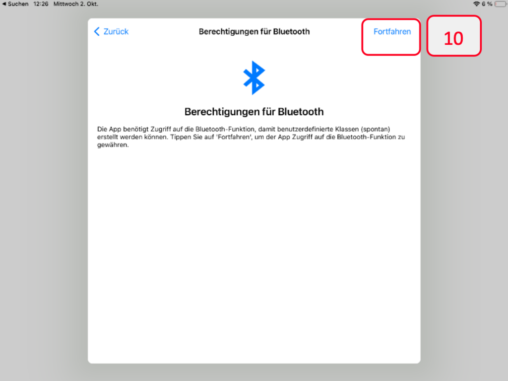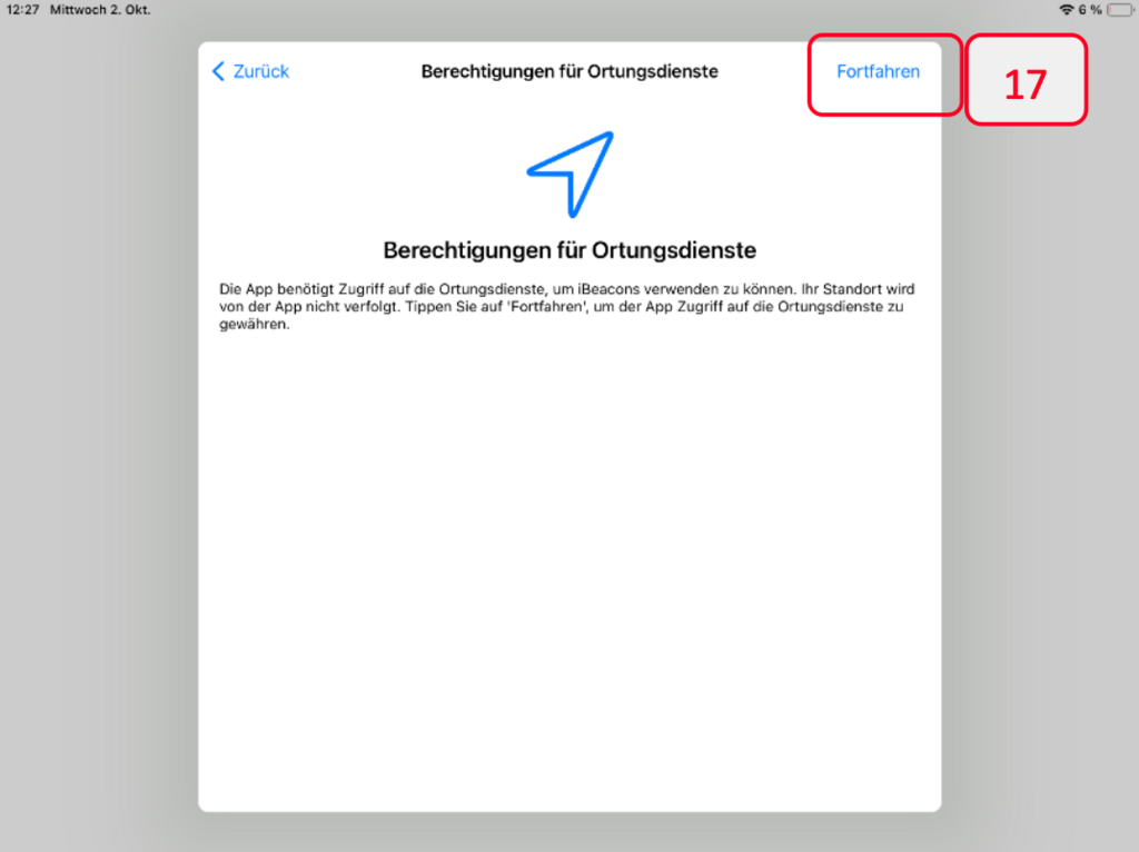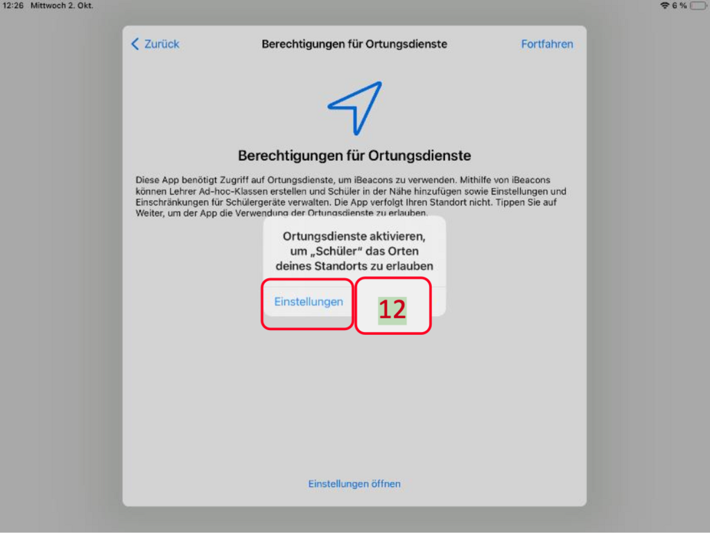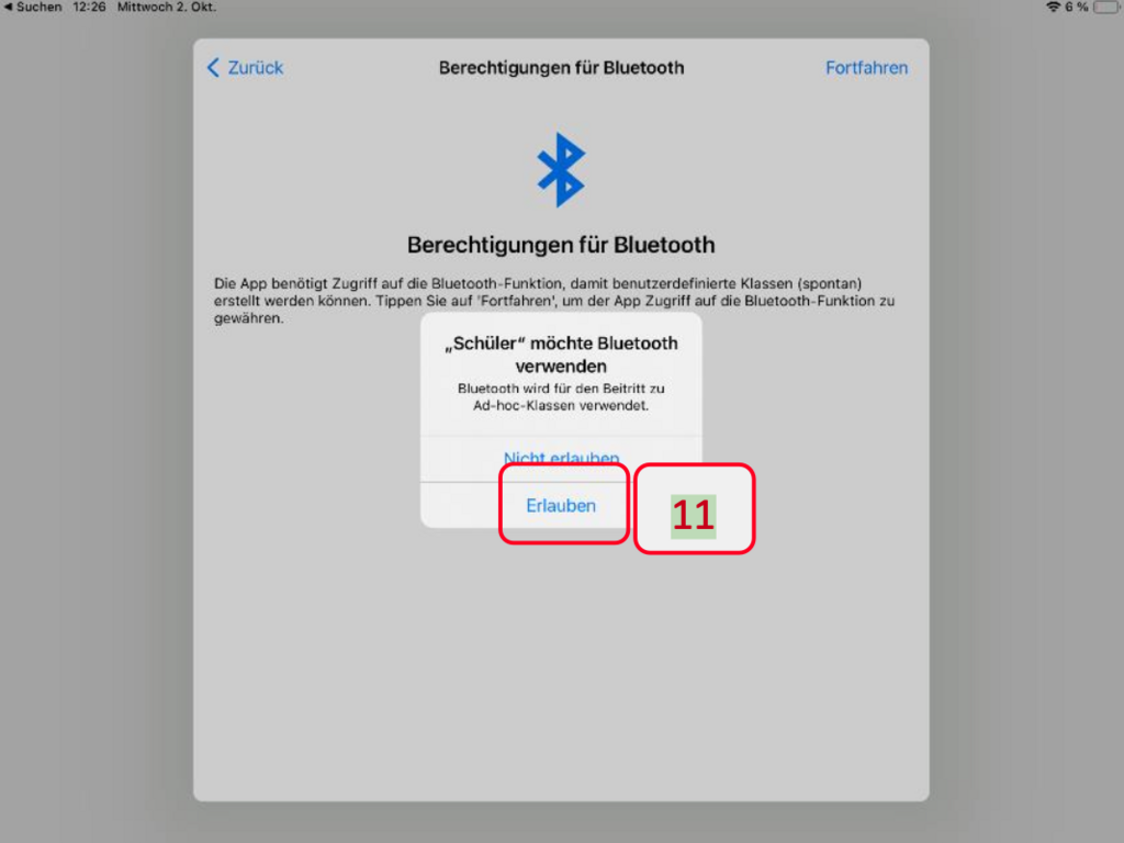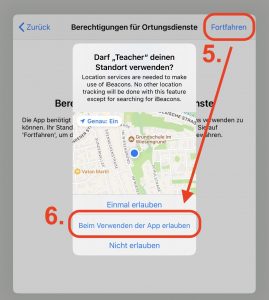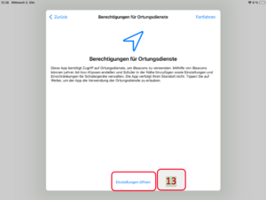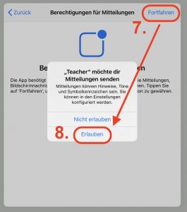Es kann sein, dass die Schülerinnen und Schüler beim ersten Start der App dieselben Mitteilungen angezeigt bekommen. Sie sollen dabei dieselbe Auswahl treffen, wie ihr (siehe Schritte 2.-8.).