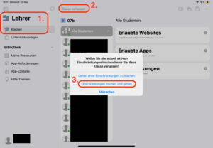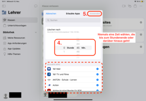Hinweis: Wenn Schülerinnen und Schüler ihre Taschen packen, bevor die Sperren aufgehoben wurden, kann es passieren, dass die Sperren auch nach Ablauf der Frist und auch nach manueller Freigabe (siehe nächster Punkt) weiter bestehen! Wählt daher niemals eine Zeit bis zum Stundenende, da idR. früher eingepackt wird.
