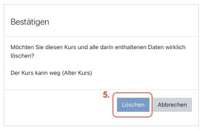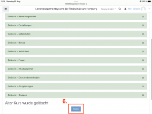 Achtung: Kommt es hierbei zu einer Fehlermeldung oder wird der Kurs einfach nicht gelöscht/der Prozess dauert zu lange, dann entfernt zunächst händisch große Inhalte (Videos, große Arbeitsblätter, volle Aufgaben etc.) aus dem Kursraum und probiert den Löschvorgang anschließend erneut.